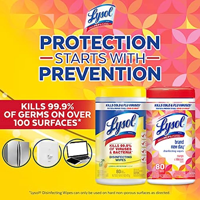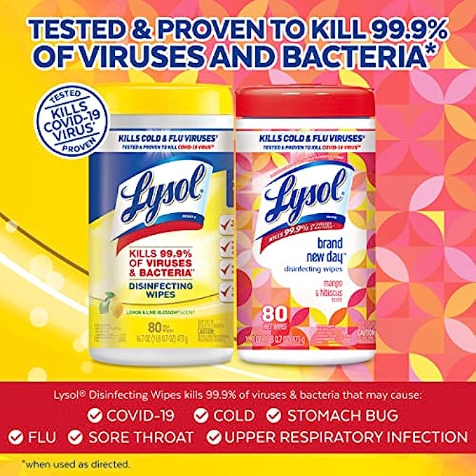 • DISINFECTING WIPES FOR CLEANING: Disinfect and deodorize with the fresh smells of Lemon & Lime Blossom and Mango & Hibiscus Lysol Disinfecting Wipes; Safely wipe down spills and remove allergens, including pet dander, dust mites, and pollen​