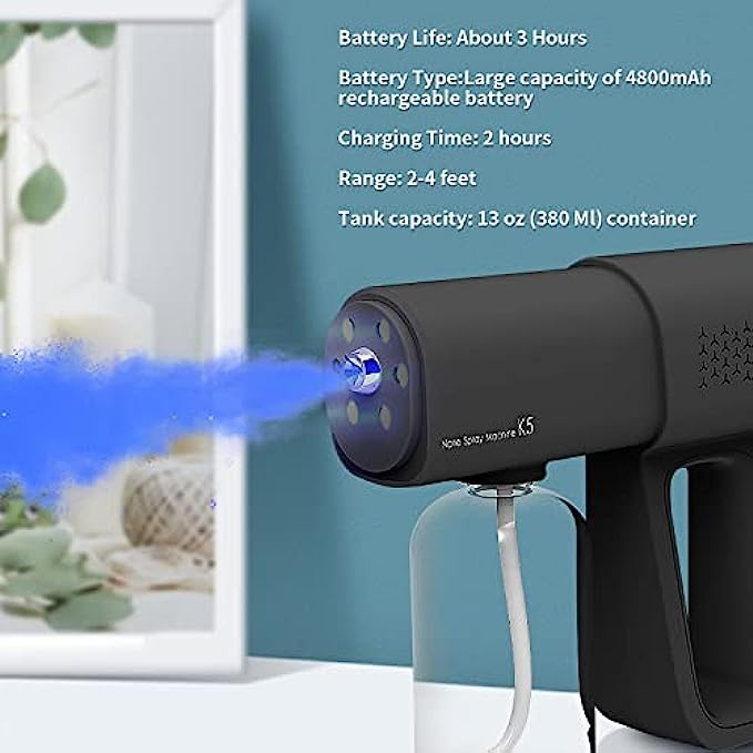 Professional Disinfectant Fogger Machine, 380ml Wireless Nano Sprayer Gun Handheld Sanitizer Fogger, Blue Light Foggers for Touchless Sanitization (Black)