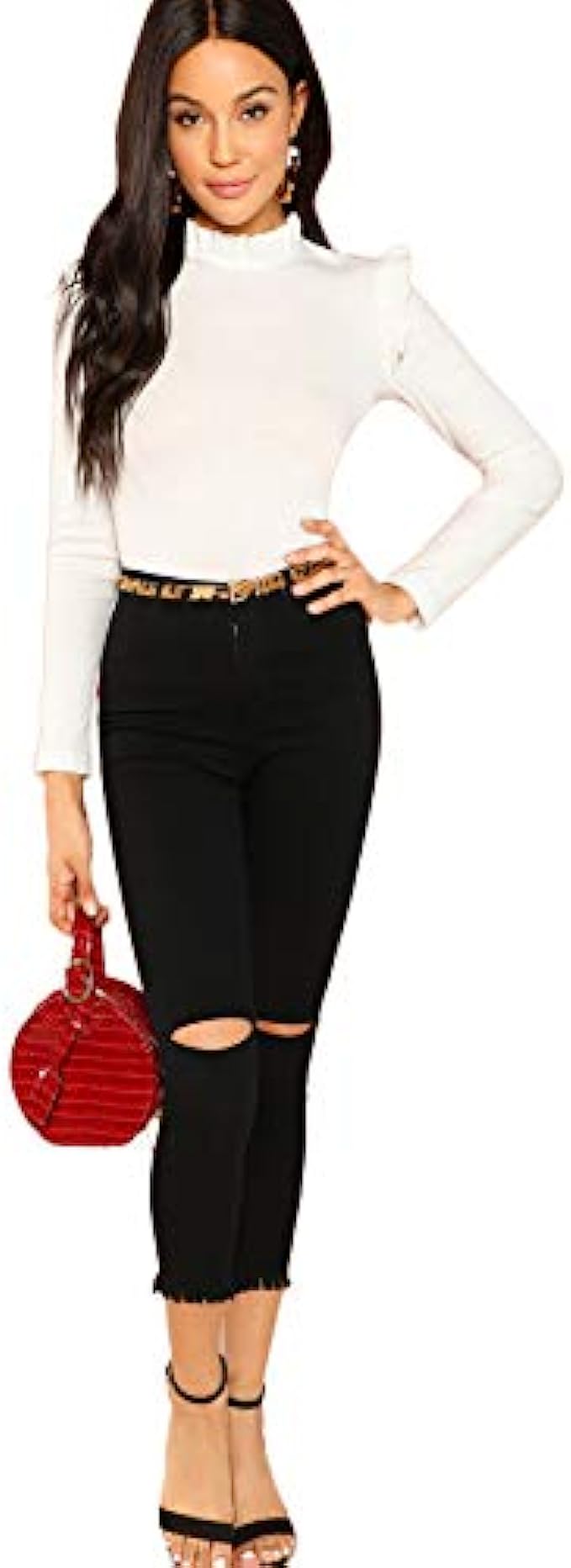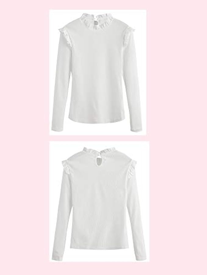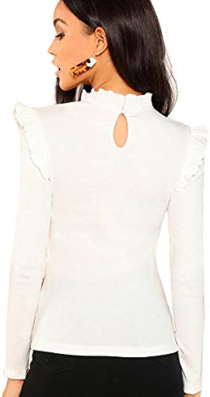 Romwe Women’s Stand Collar Slim Fit Frilled Ruffles Shoulder Solid Keyhole Blouse Top
