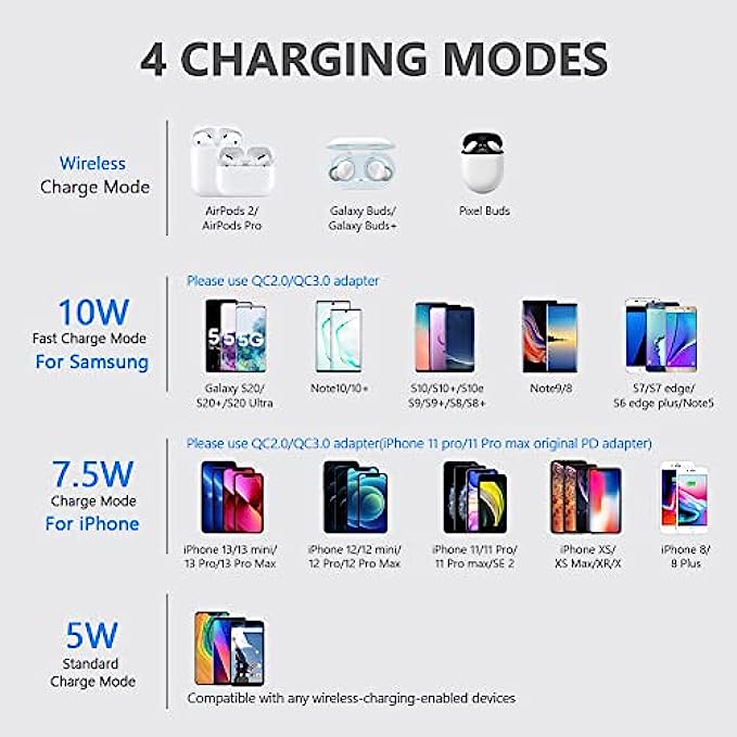 • ▶[3 CHARGING MODES AVAILABLE FOR DIFFERENT PHONES]: 7.5W charging mode is compatible with iPhone 13/13 Pro/13 Mini/13 Pro Max/SE 2022/12/SE 2020/11/XS/XR/X/8;10W charging mode is compatible with S22/S22 Ultra/S21/S20/Note 10/10 Plus/S10/S10 Plus/S10E/Note9/S9/S8 and so on;5W charging mode works on any wireless-charging-enabled devices like Google Pixel 3/3XL/4XL and other wireless-charging-enabled phones. Note:Adapter is Not Included,QC 2.0/3.0 adapter will be highly recommended.